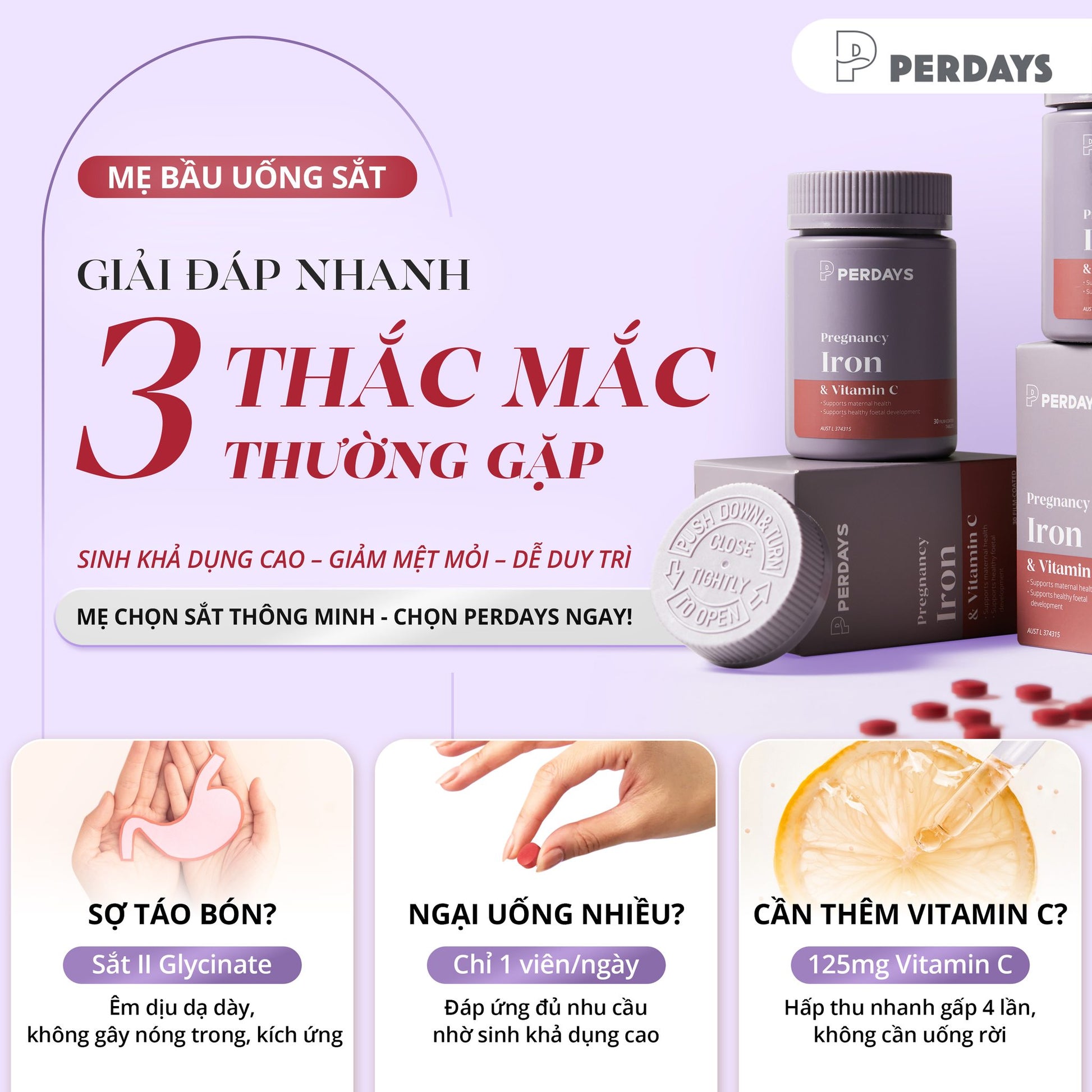 Viên uống bổ sung Sắt Hữu Cơ Sinh Khả Dụng Cao - Perdays Pregnancy Iron & Vitamin C - Hỗ Trợ Bổ Sung Sắt